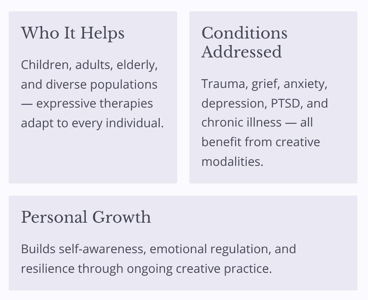 It's not about artistic talent. The healing power lies in the process of self-expression — exploring feelings, thoughts, and bodily sensations freely.