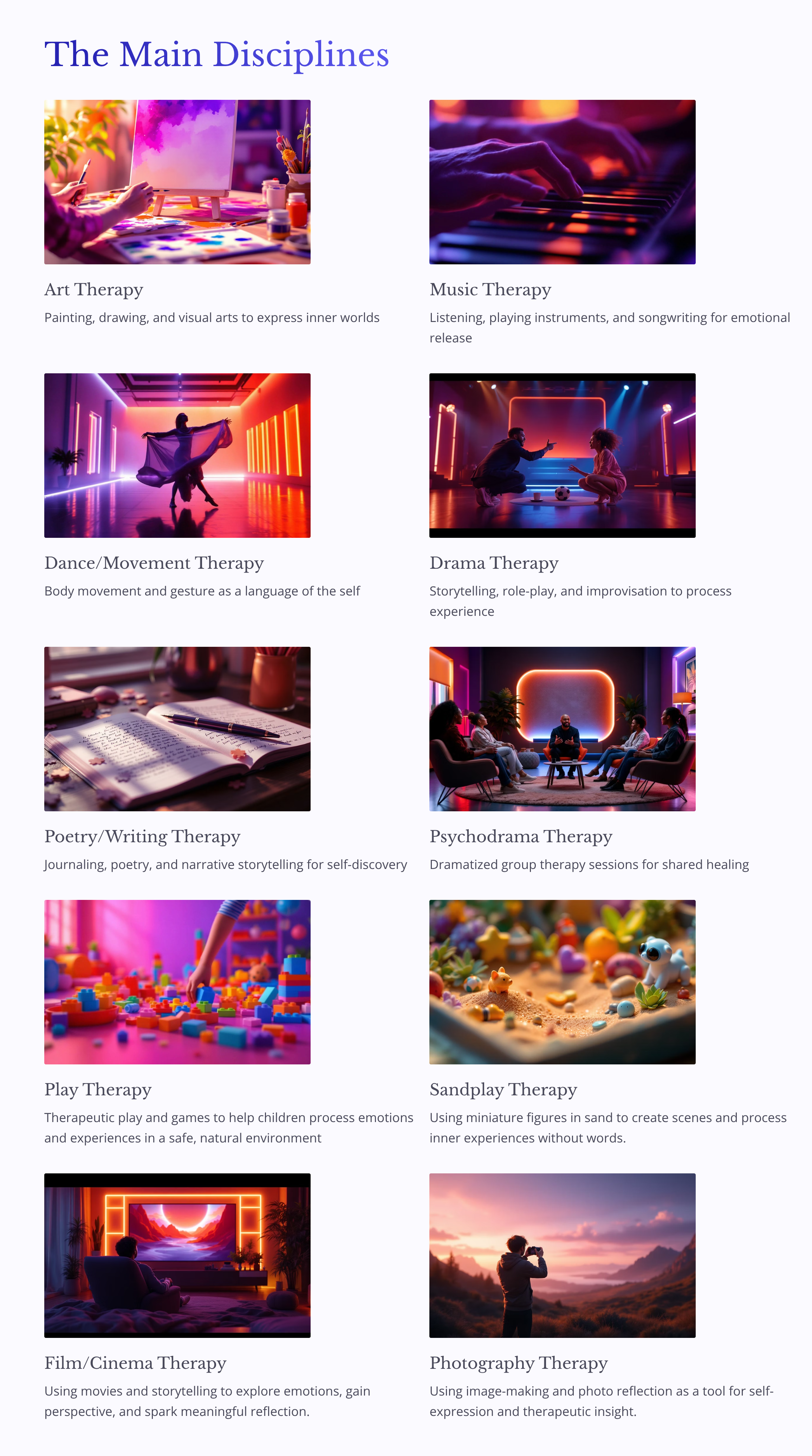 Art, music, dance, drama, play, and poetry are used as therapeutic tools to promote emotional and psychological healing.
